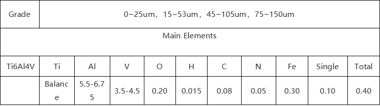 Ti6Al4V (GR5, TC4) powder is based on titanium and is optimized for performance by incorporating two core alloying elements, aluminium and vanadium. The specific composition is titanium (in excess), with the mass fraction of aluminium ranging from 5.5% to 6.75%, and the mass fraction of vanadium ranging from 3.5% to 4.5%. Aluminium, as an element stabilizing the α phase, enhances the alloy's strength, while vanadium, as an element stabilizing the β phase, improves processing properties. Together, these two elements enable the alloy to possess multiple advantages.